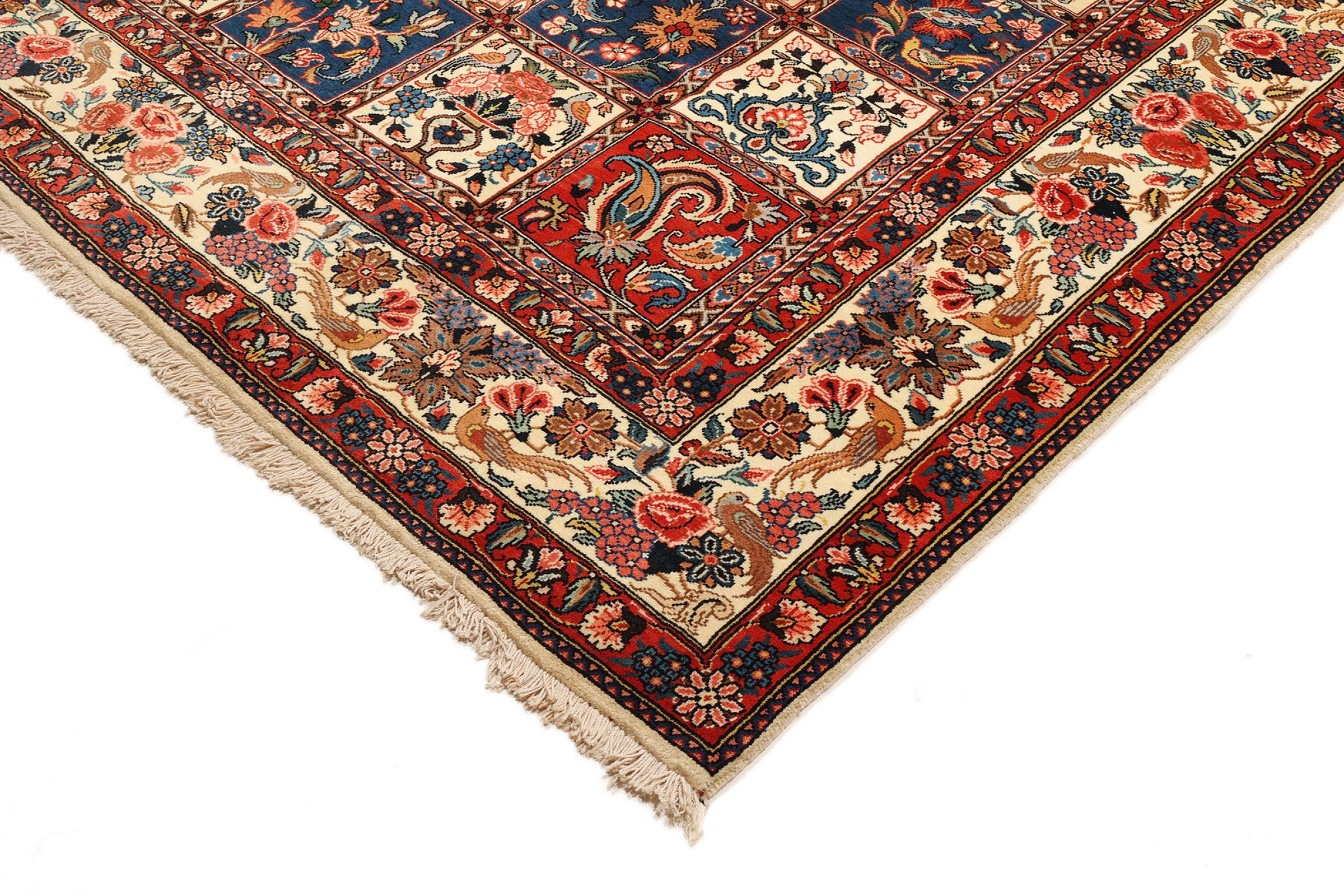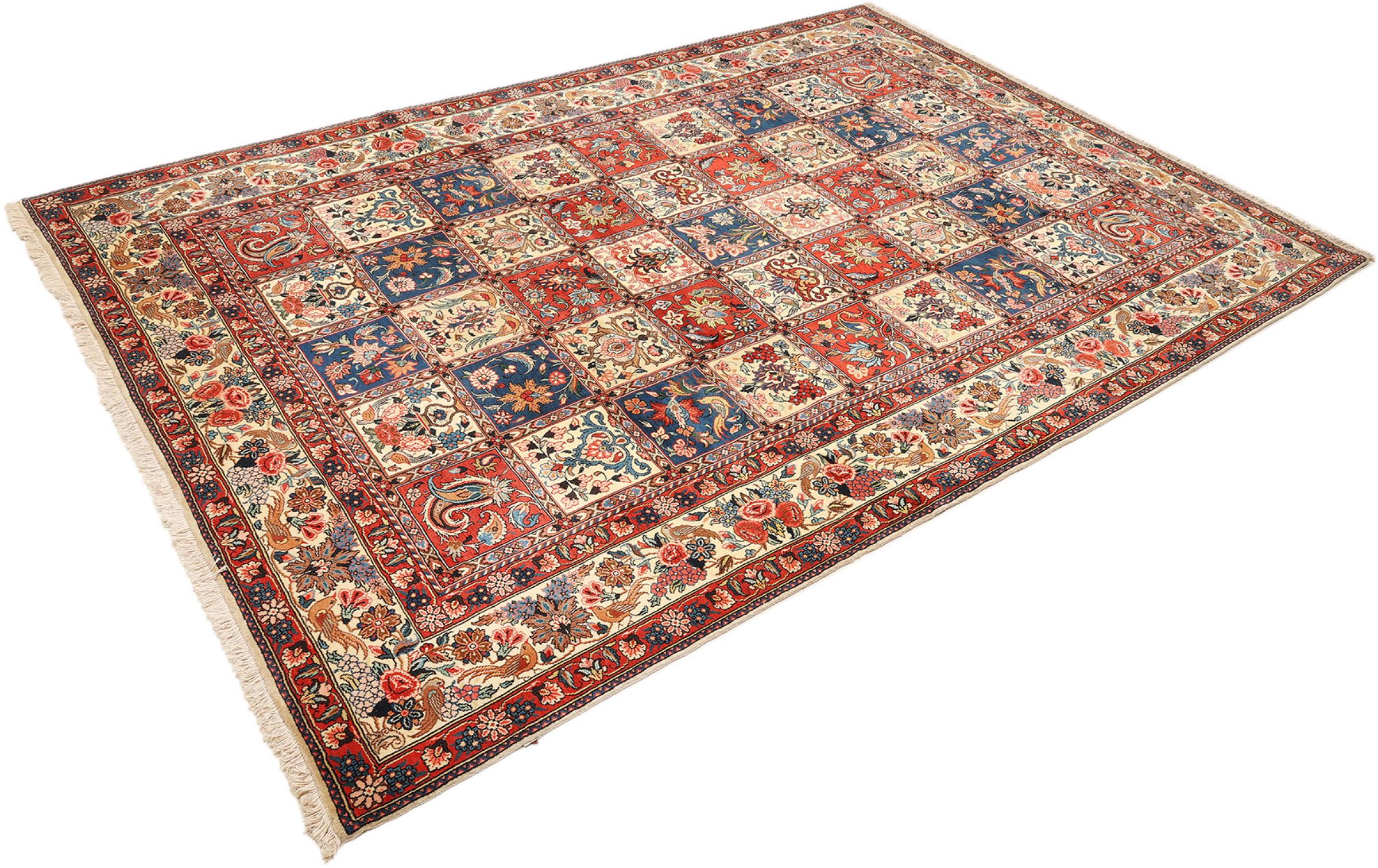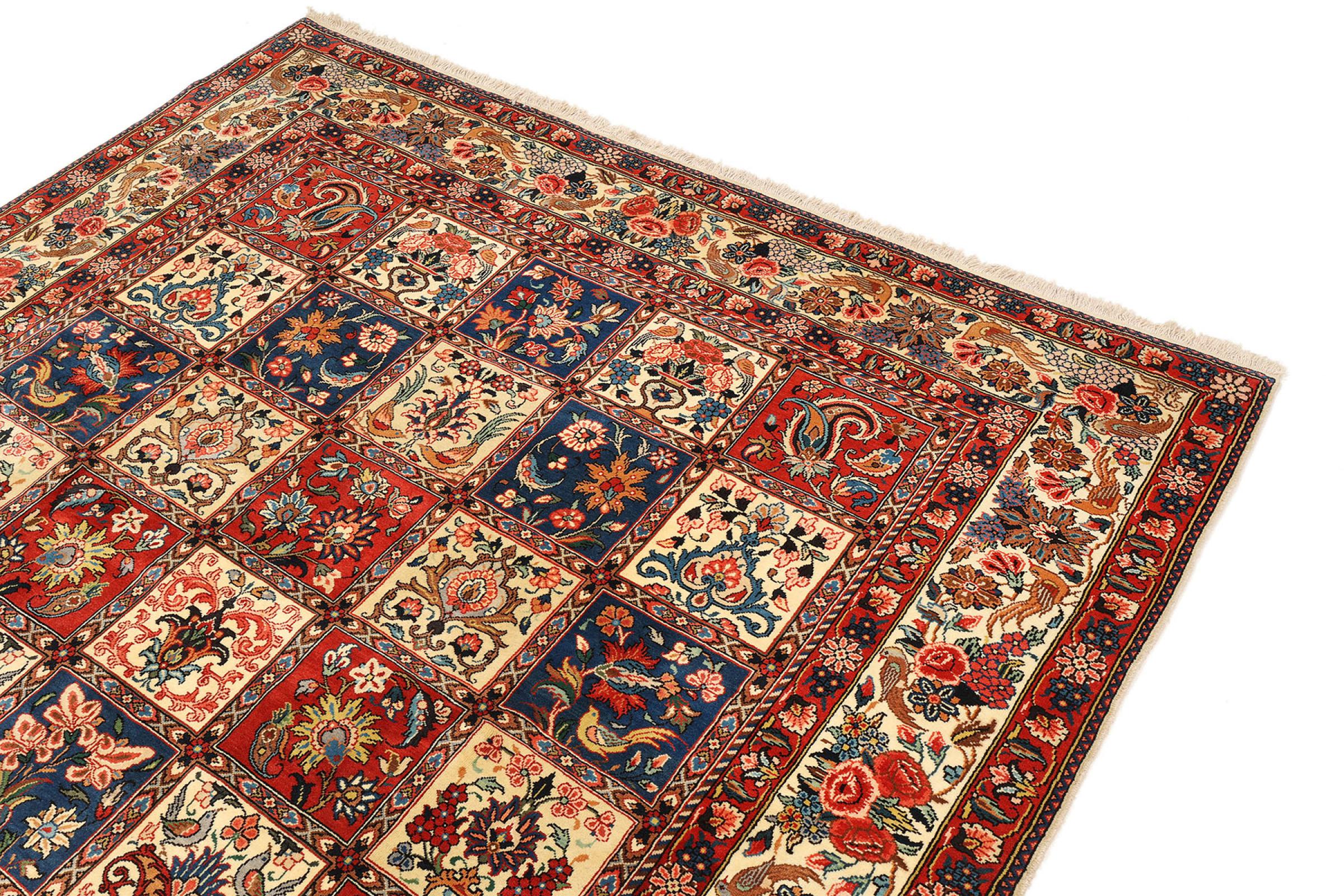 Tämän persialaisen bahtiarin solmivat käsin Bakhtiari-heimon paimentolaiset. Tämä persialainen matto leikkii itämaan väreillä kauniilla kuvioilla. Sen koristeiden suunnittelu on inspiroinut persialaisia ​​puutarhoja. Niin kutsutusta perinteisestä puutarhasuunnittelusta on tullut erittäin suosittu länsimaissa vuosien varrella. Sen suuri solmujen tiheys yhdessä vahvan langan kanssa lupaa pitkäaikaista nautintoa persialaisesta matoteoksesta.