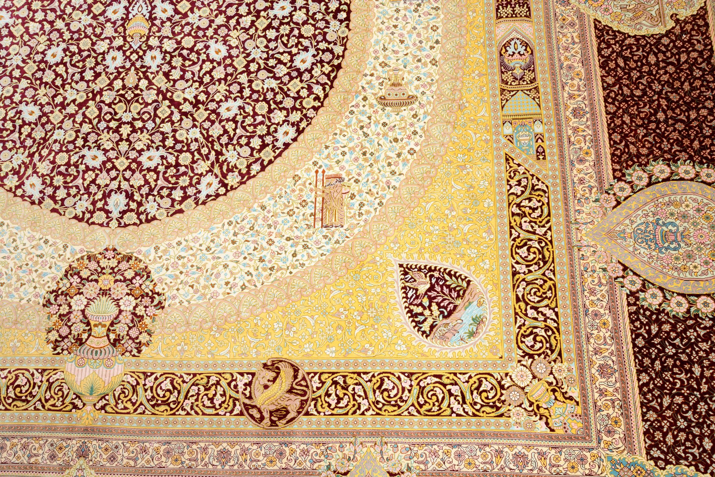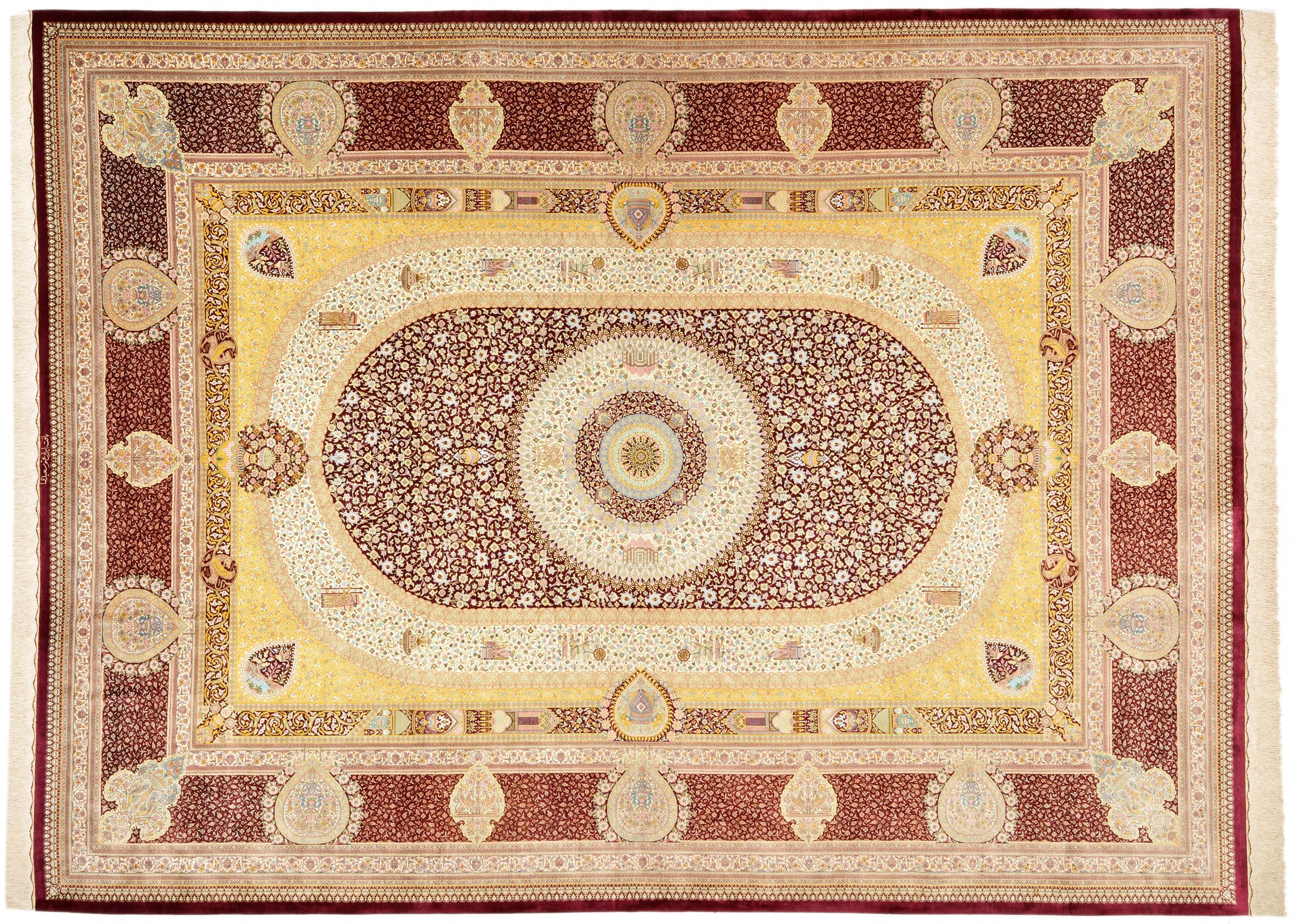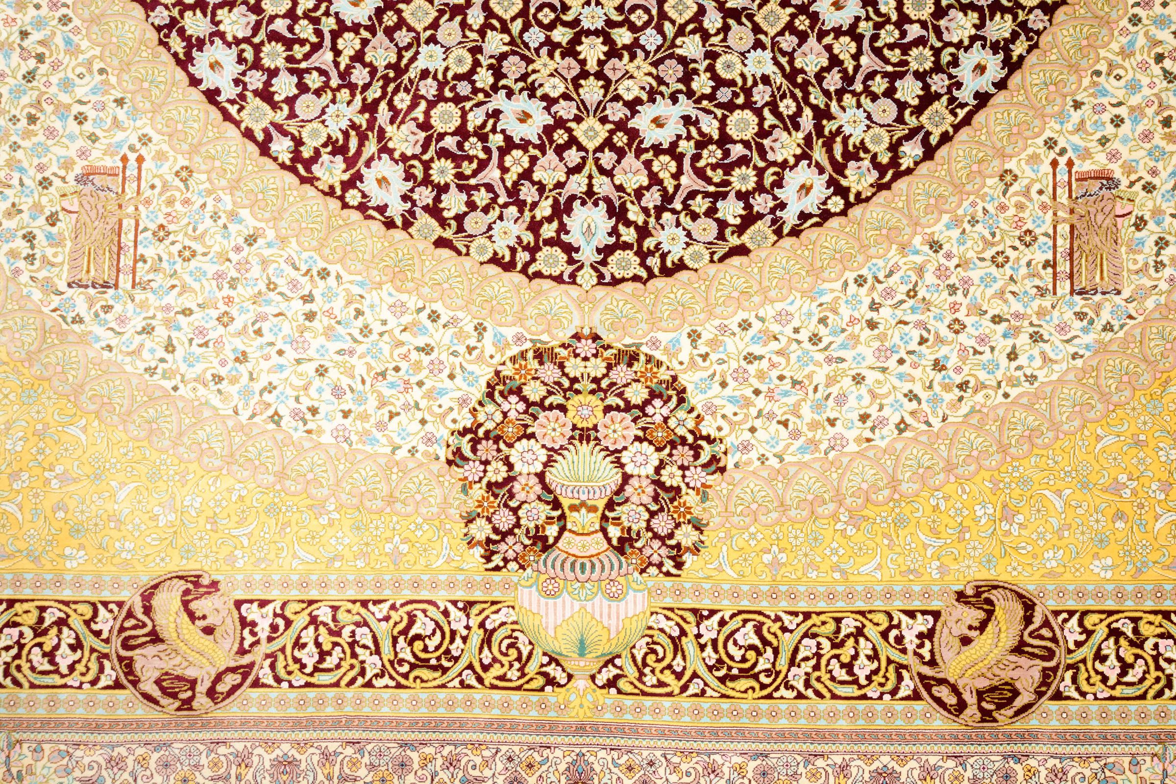 Maton nro.: 127350009914913 Koko: 391x293 cm Paksuus: n. 3 mm Solmua: 1 000 000 / m² Työstäminen: Solmittu käsin Nukka: Silkki Loimi: Silkki Alkuperä: Persia / Iran Ikä: uusi Paino: n. 23 kg Készleten: Uniikki - Csak 1 van készleten