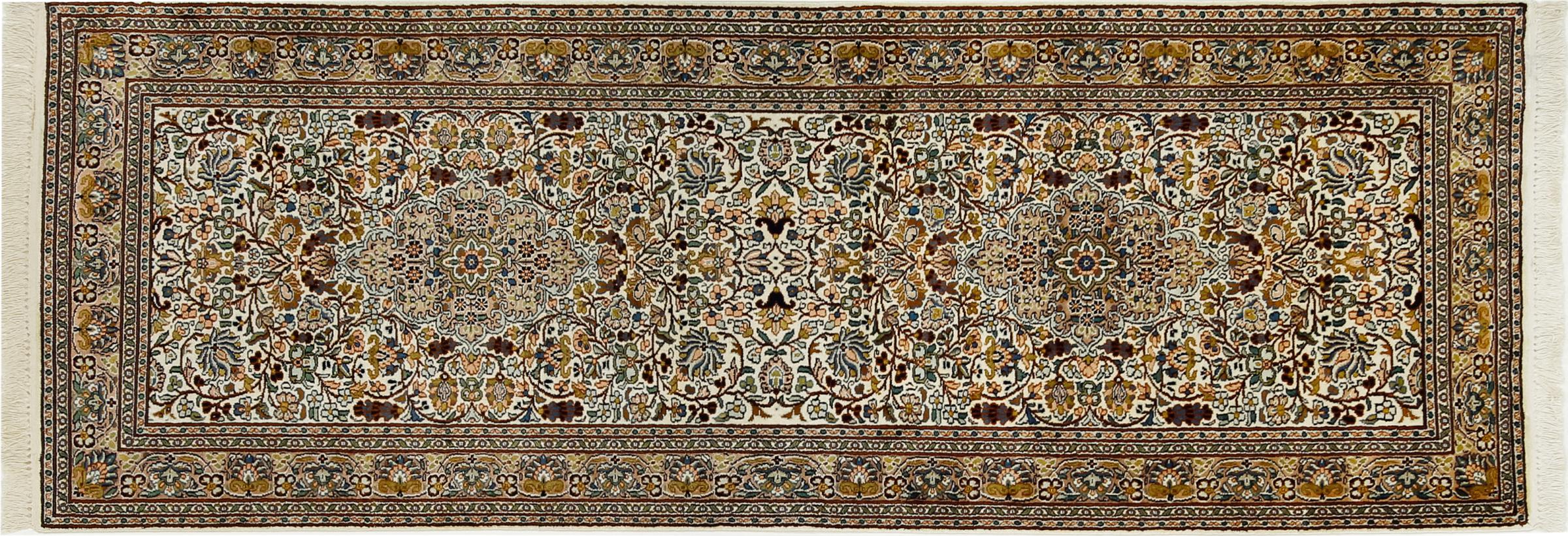Tämä käsinsolmittu silkkimatto Kaschmirista kuvastaa intialaisten matonsolmijien osaamista, Parhaista materiaaleista vaikuttavia kuvioita käsinsolmittuna. Palanen intialaista ylellisyyttä Teille.