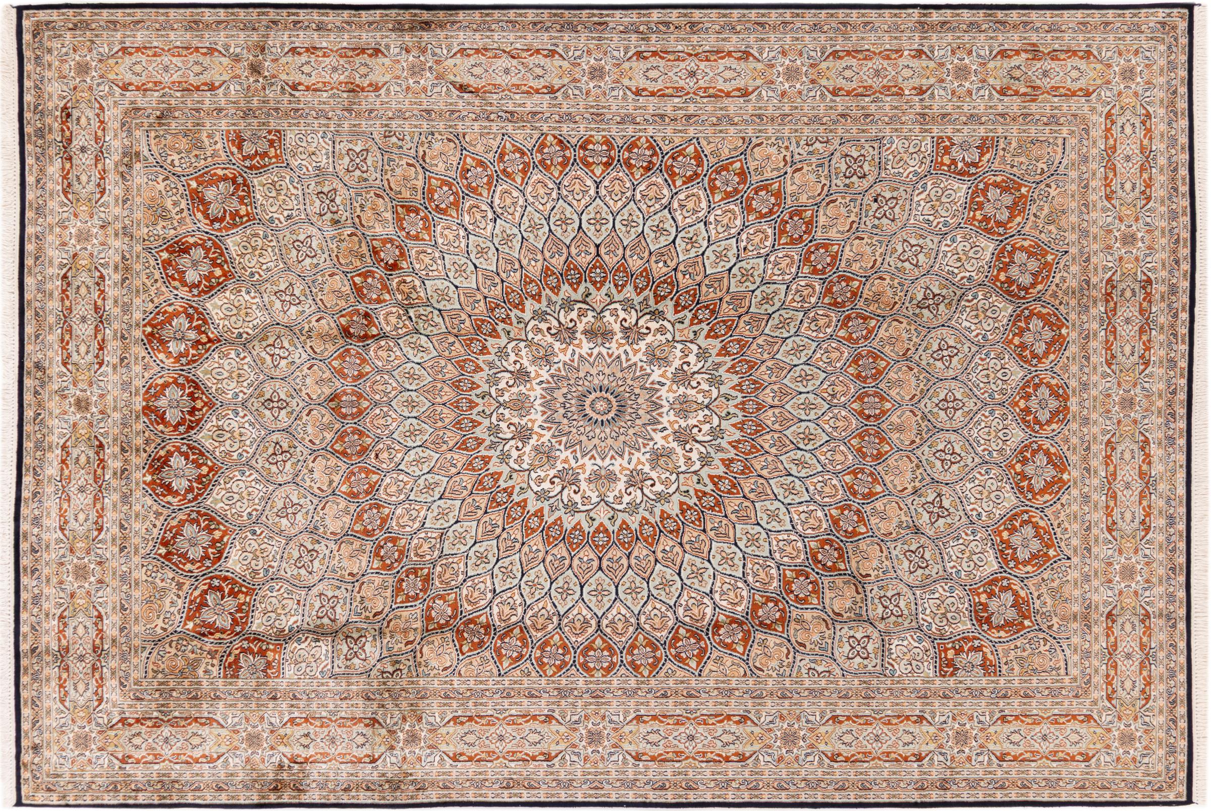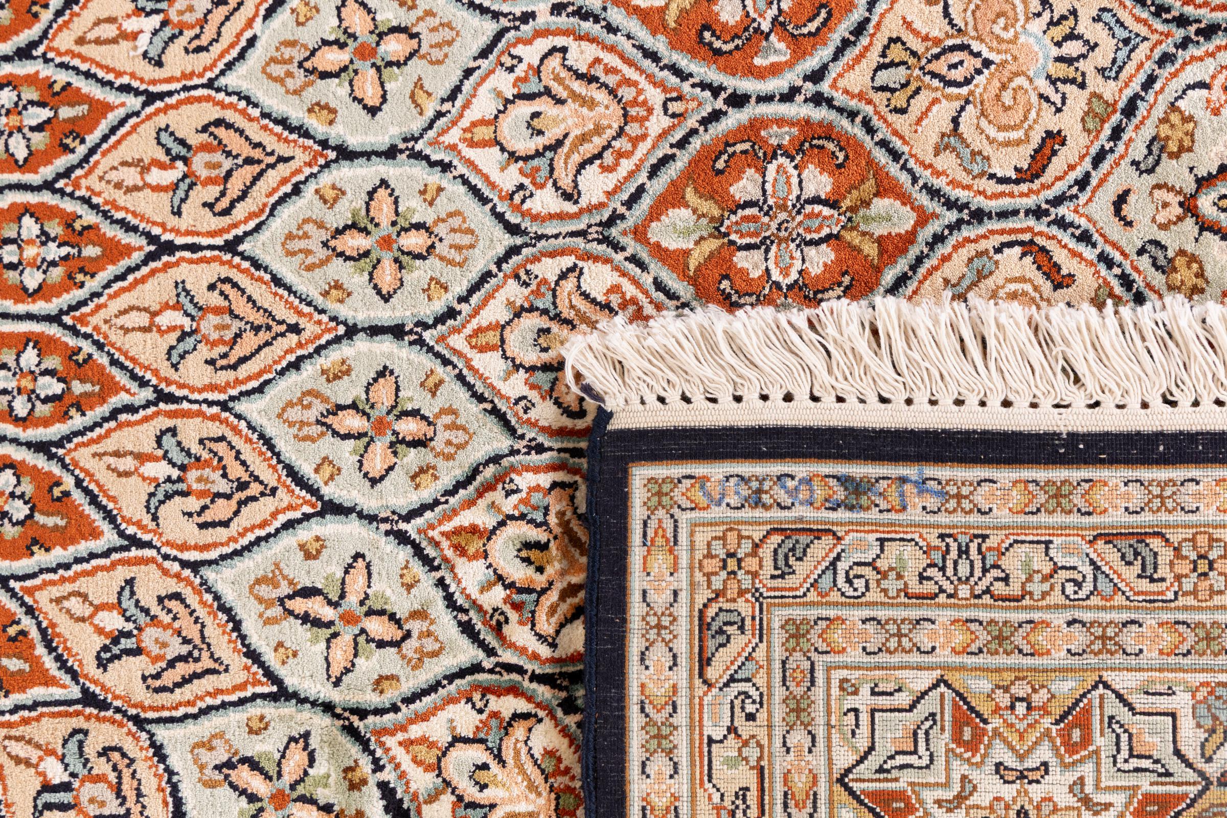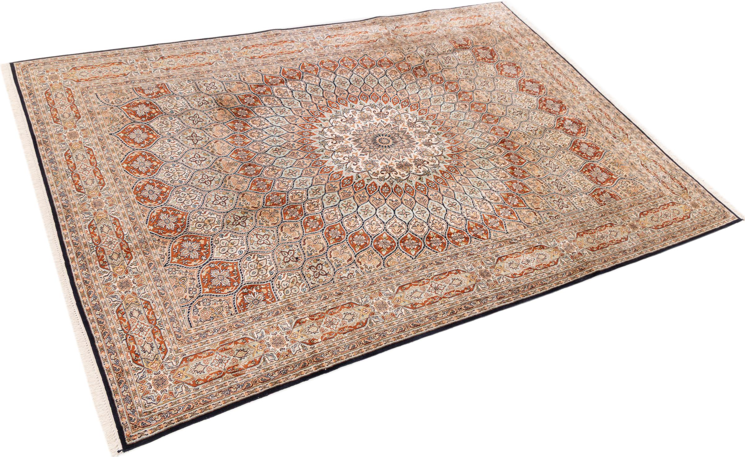 Tämä käsinsolmittu silkkimatto Kaschmirista kuvastaa intialaisten matonsolmijien osaamista, Parhaista materiaaleista vaikuttavia kuvioita käsinsolmittuna. Palanen intialaista ylellisyyttä Teille.