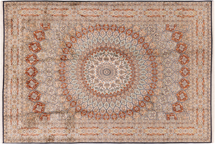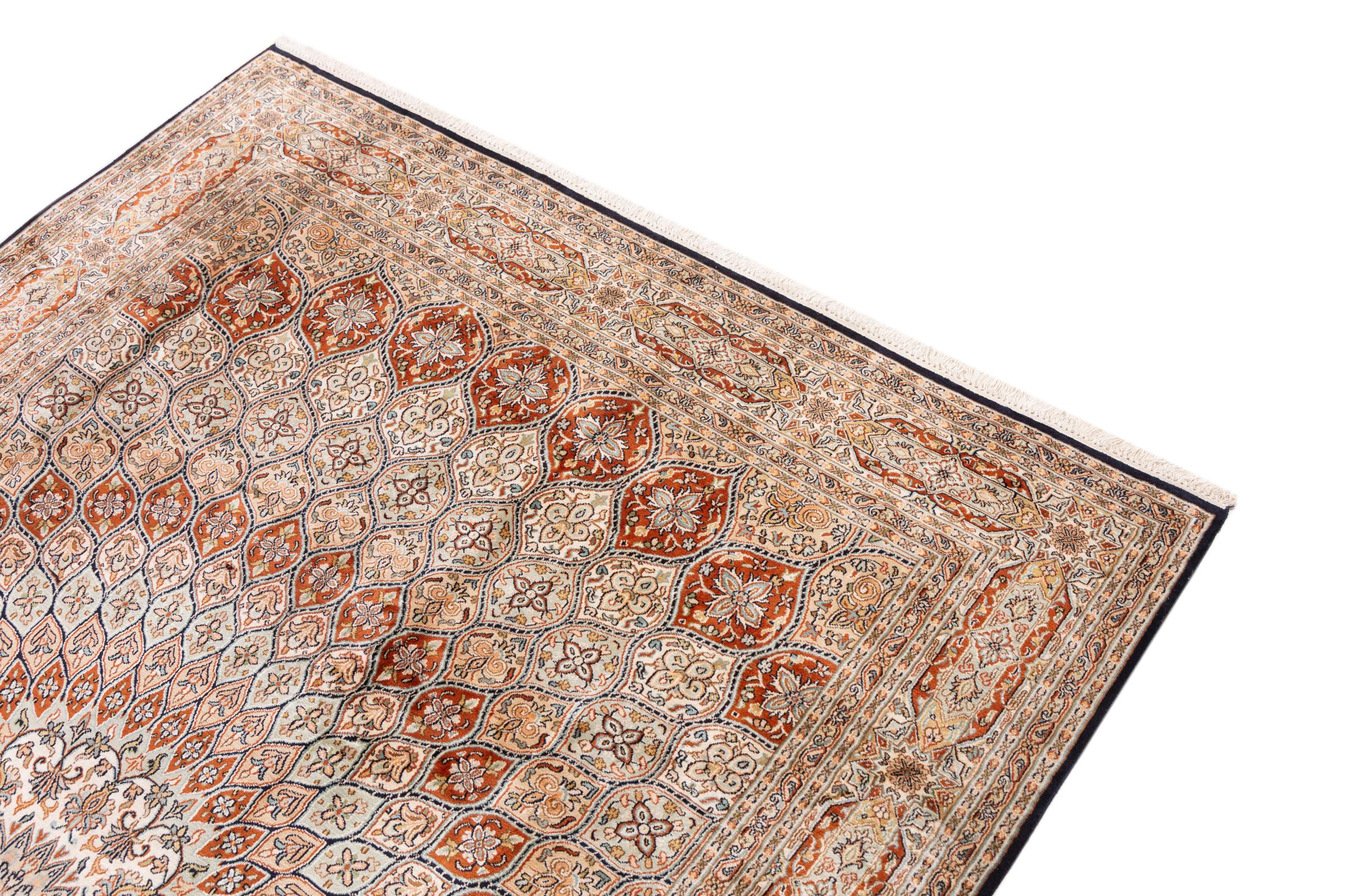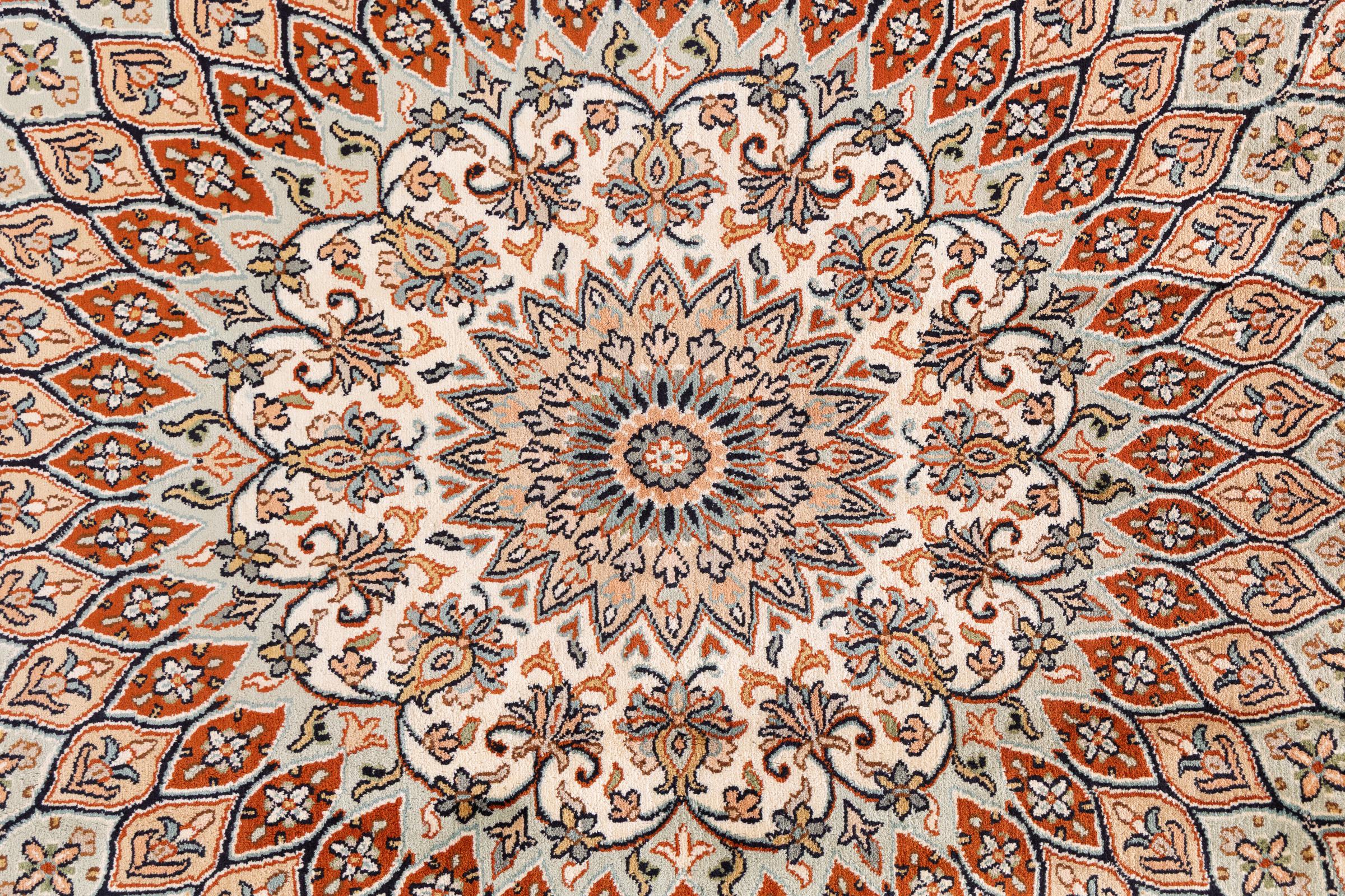 Tämä käsinsolmittu silkkimatto Kaschmirista kuvastaa intialaisten matonsolmijien osaamista, Parhaista materiaaleista vaikuttavia kuvioita käsinsolmittuna. Palanen intialaista ylellisyyttä Teille.