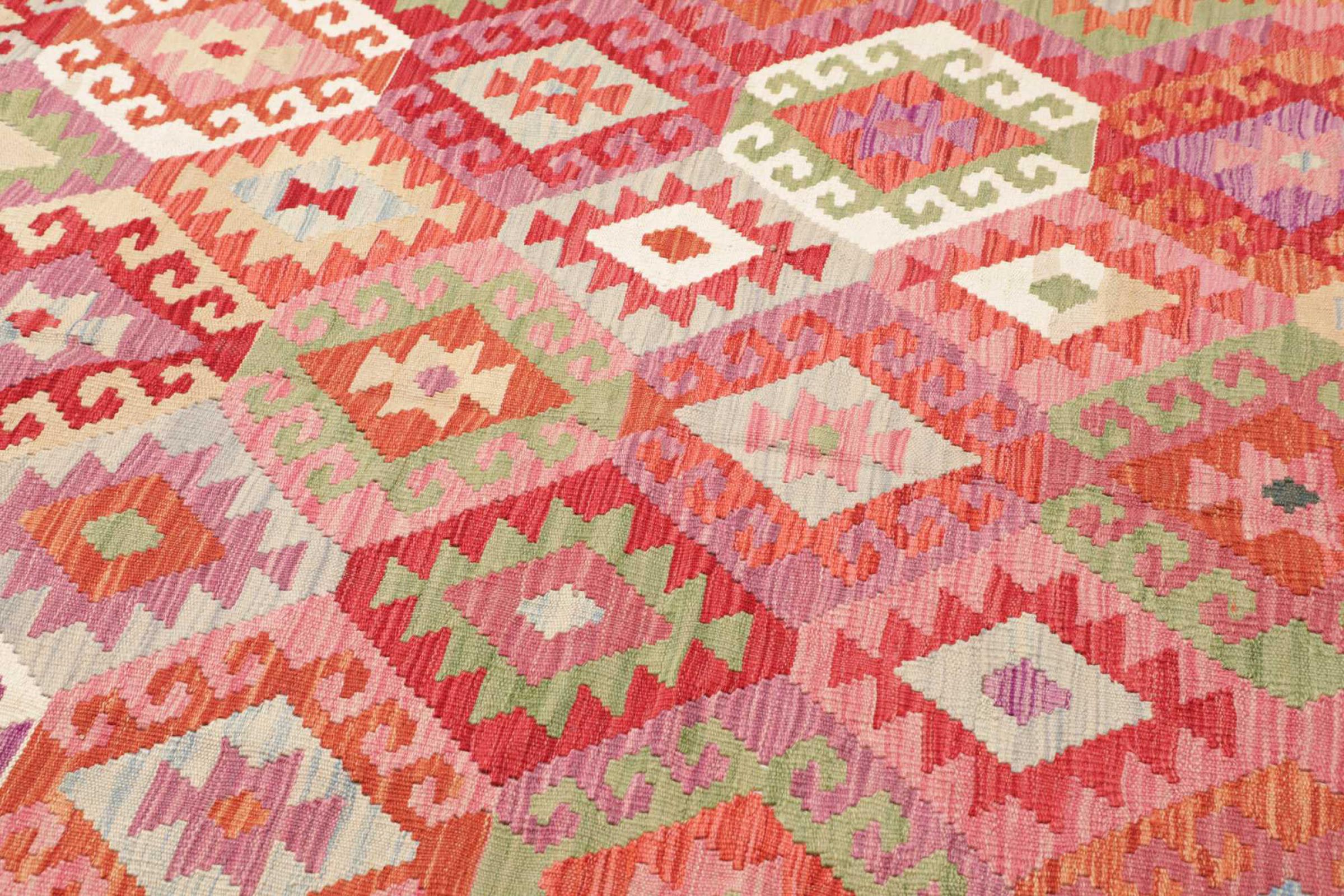 Tämä käsinkudottu Kelim-Afghan on väriensä ja tyypillisten kuvioidensa ansiosta todella kaunis. Se on Afganistanissa 100% villasta käsinkudottu. Kestävä ja pitkäikäinen myös sen lisäksi. Voitto Teille ja kodillenne kautta linjan.