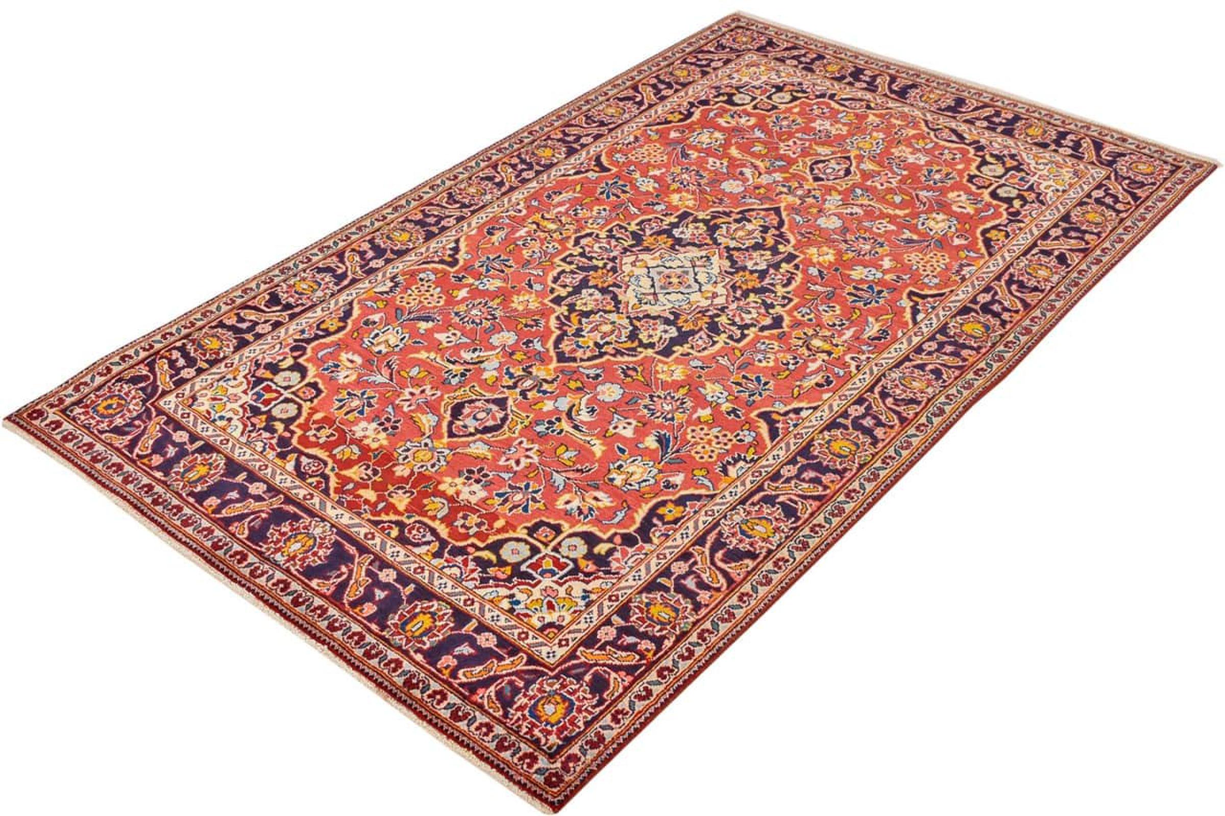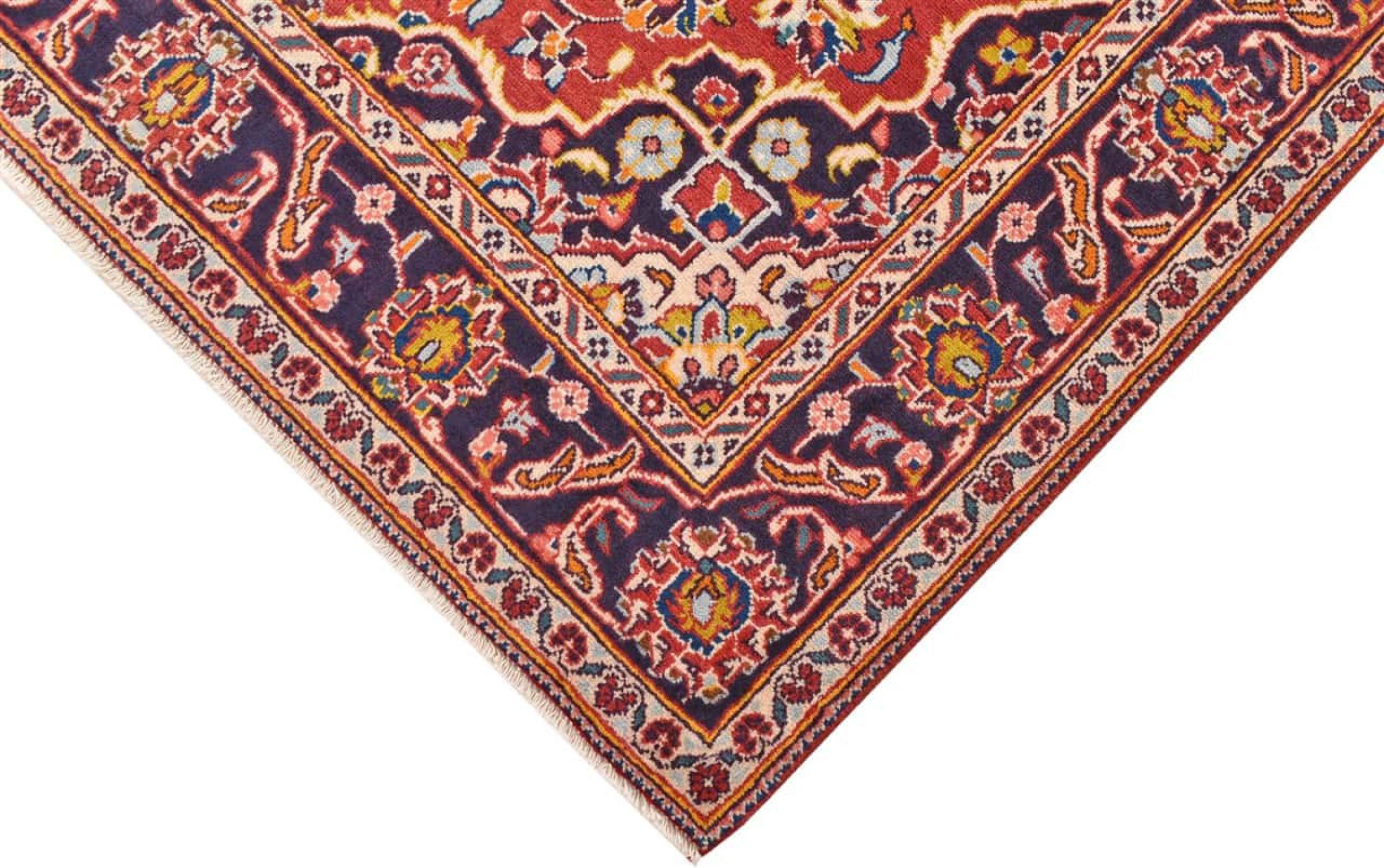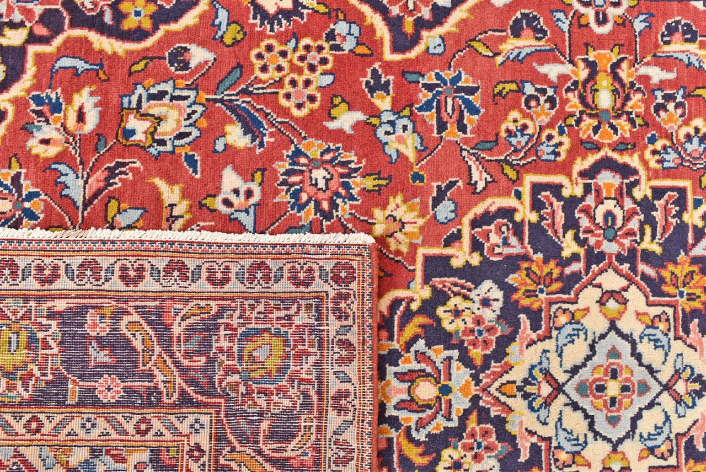 Tämä Kashanista (Keshan) kotoisin oleva matto on hyvin perinteinen ja tyypillinen persialainen muotoilu kauniilla koristeilla. Kashan-matot ovat erittäin suosittuja poikkeuksellisen tyylikkään muotoilunsa ansiosta. Nämä matot ovat peräisin Kashanista, muinaisen Silkkitien varrella sijaitsevasta kaupungista. Tämä matto on solmittu käsin korkealaatuisesta lampaanvillasta, ja se tulee olemaan ainutlaatuinen kohokohta kotiisi.