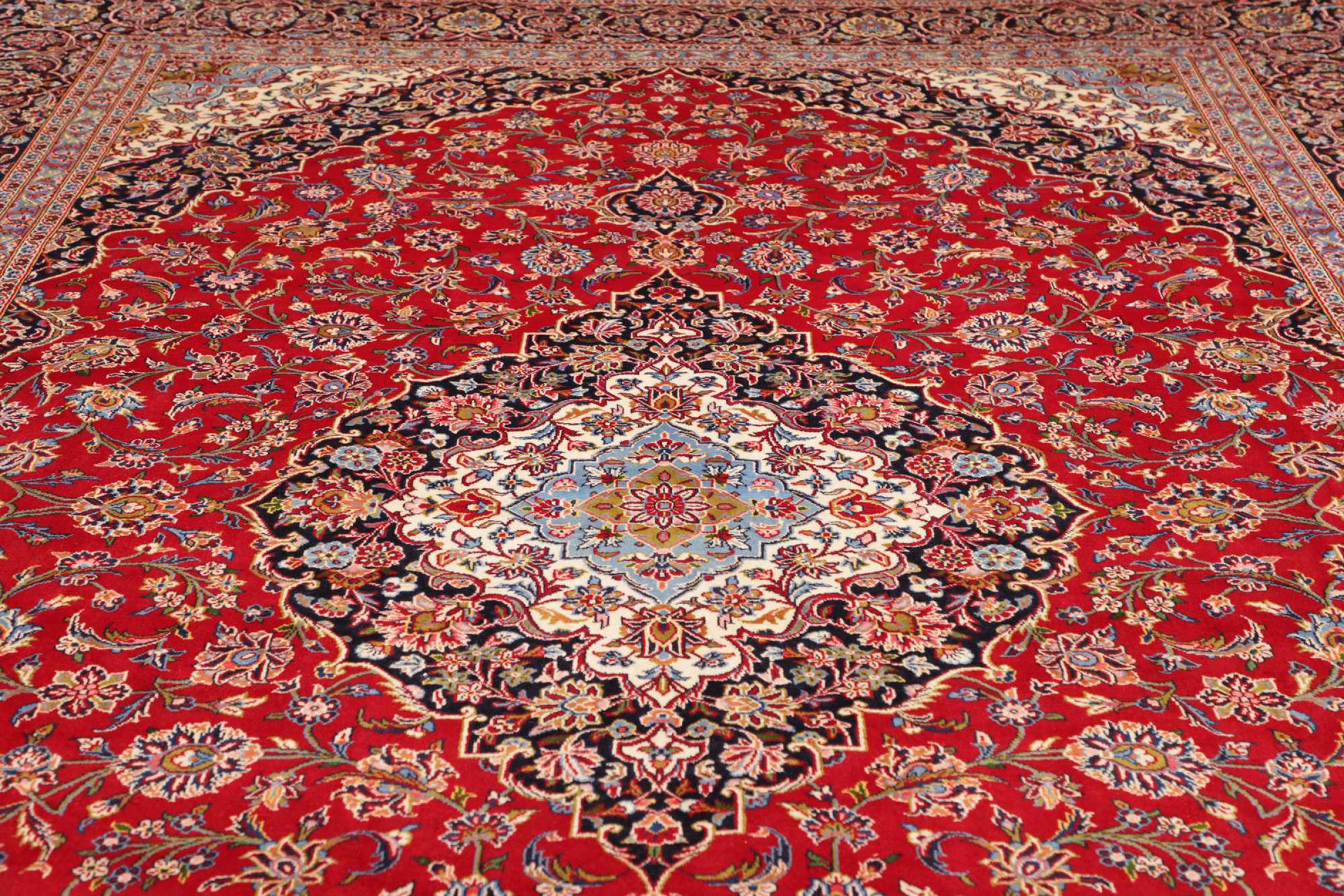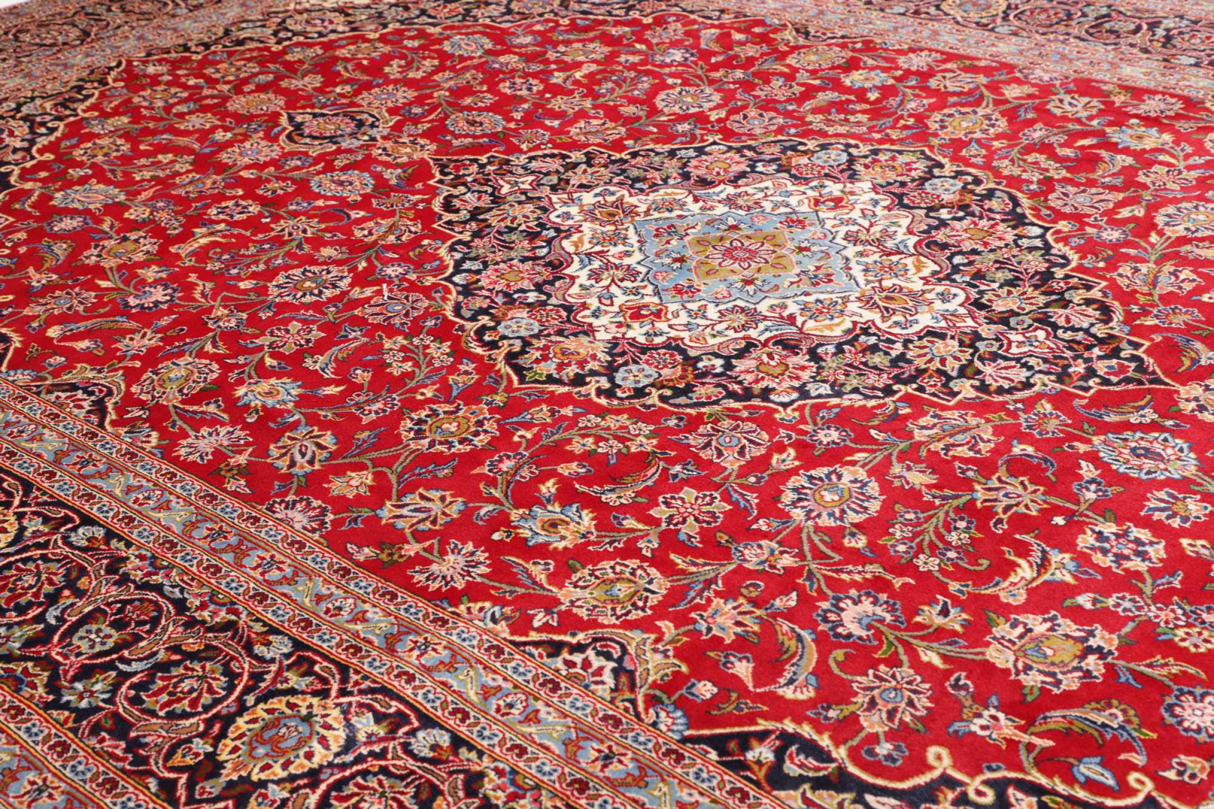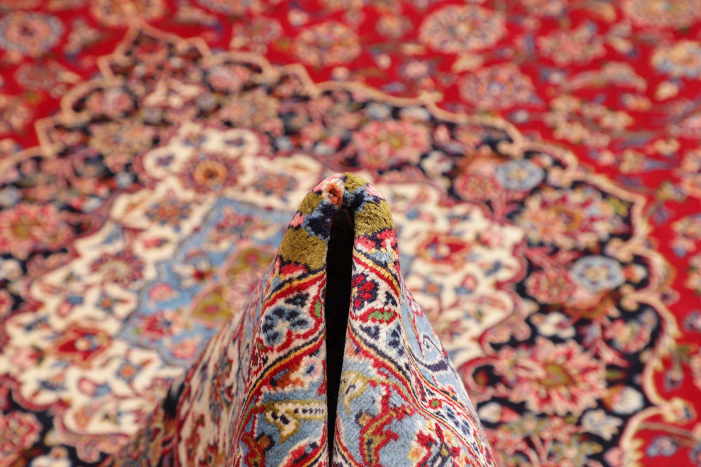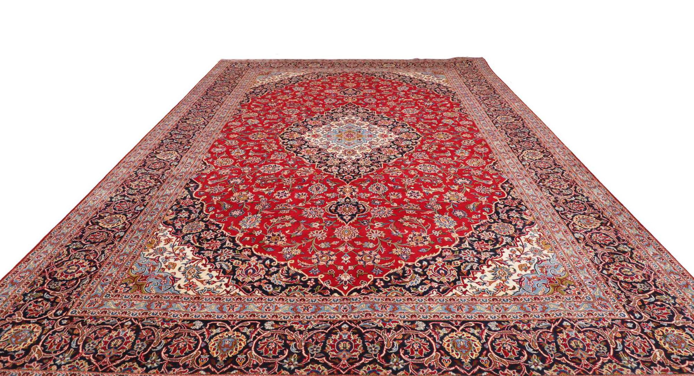 Tämä Kashanista (Keshan) kotoisin oleva matto on hyvin perinteinen ja tyypillinen persialainen muotoilu kauniilla koristeilla. Kashan-matot ovat erittäin suosittuja poikkeuksellisen tyylikkään muotoilunsa ansiosta. Nämä matot ovat peräisin Kashanista, muinaisen Silkkitien varrella sijaitsevasta kaupungista. Tämä matto on solmittu käsin korkealaatuisesta lampaanvillasta, ja se tulee olemaan ainutlaatuinen kohokohta kotiisi.