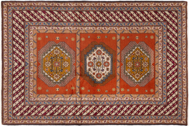 Maton nro.: 295401001898 Koko: 182x122 cm Paksuus: n. 12 mm Solmua: 128 000 - 160 000 / m² Työstäminen: Solmittu käsin Nukka: Käsinkehrätty villa Loimi: Puuvilla Alkuperä: Azerbaijan / Venäjä Ikä: vanha/lähes antiikkinen, yli 50 vuotta vanha Paino: n. 7 kg Tunnetaan myös nimellä Afghan Shirvan, Kaukasisch Készleten: Uniikki - Csak 1 van készleten