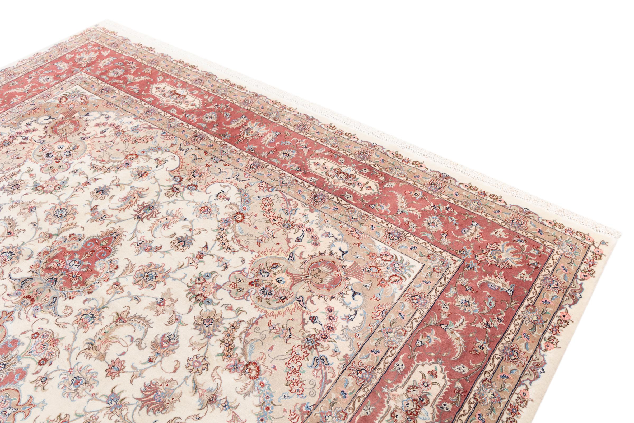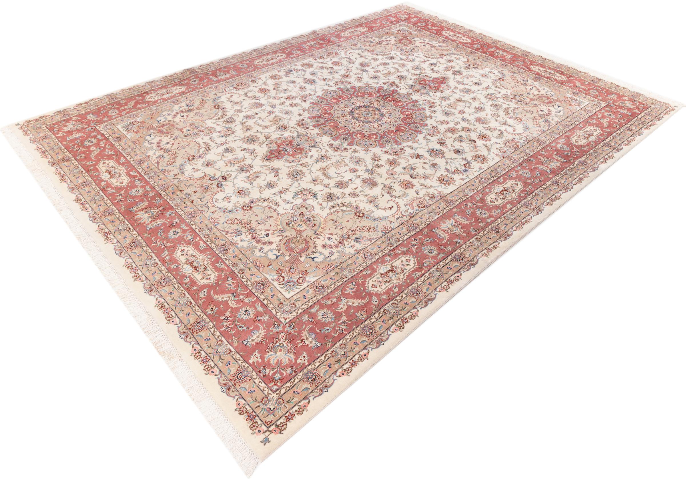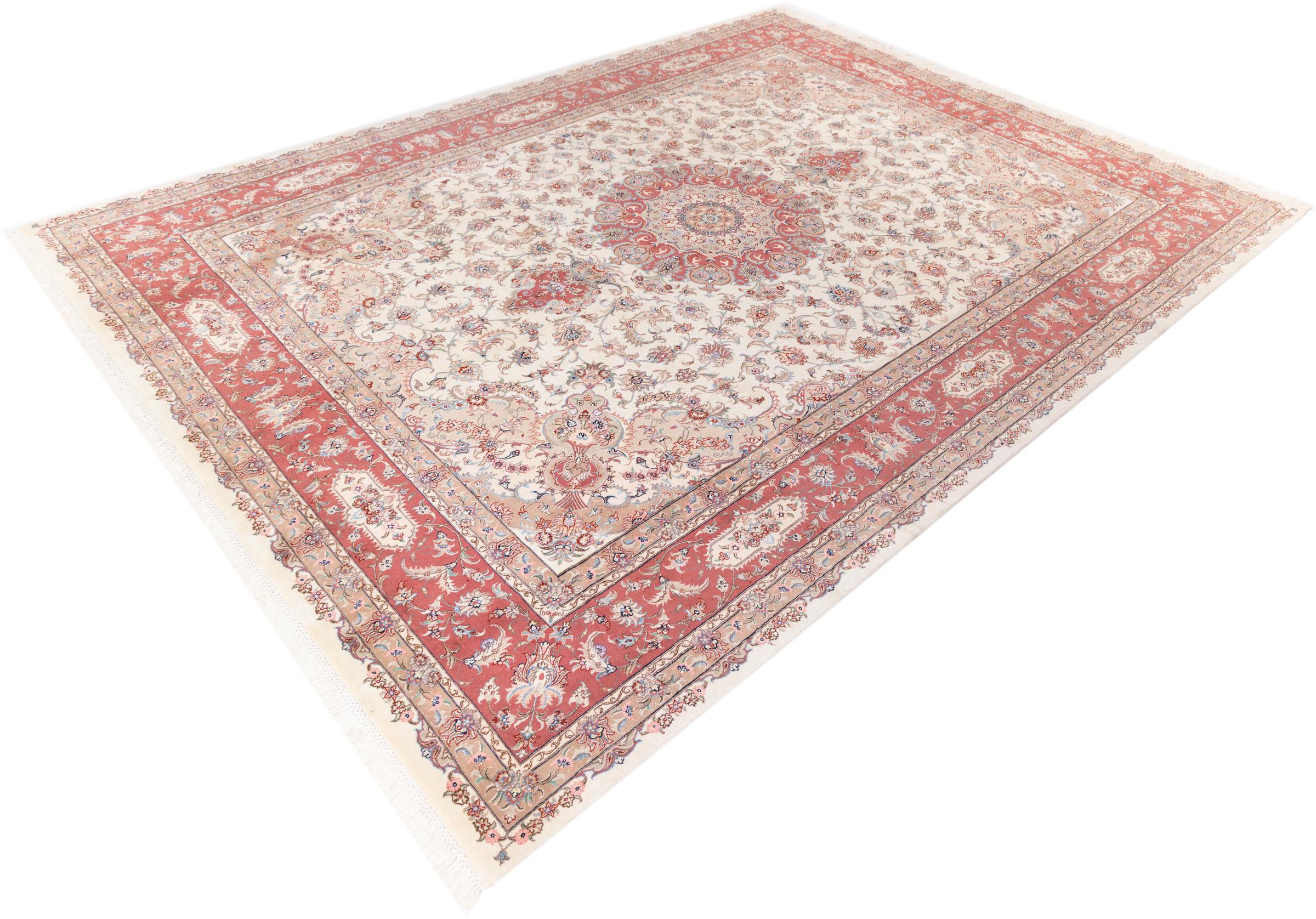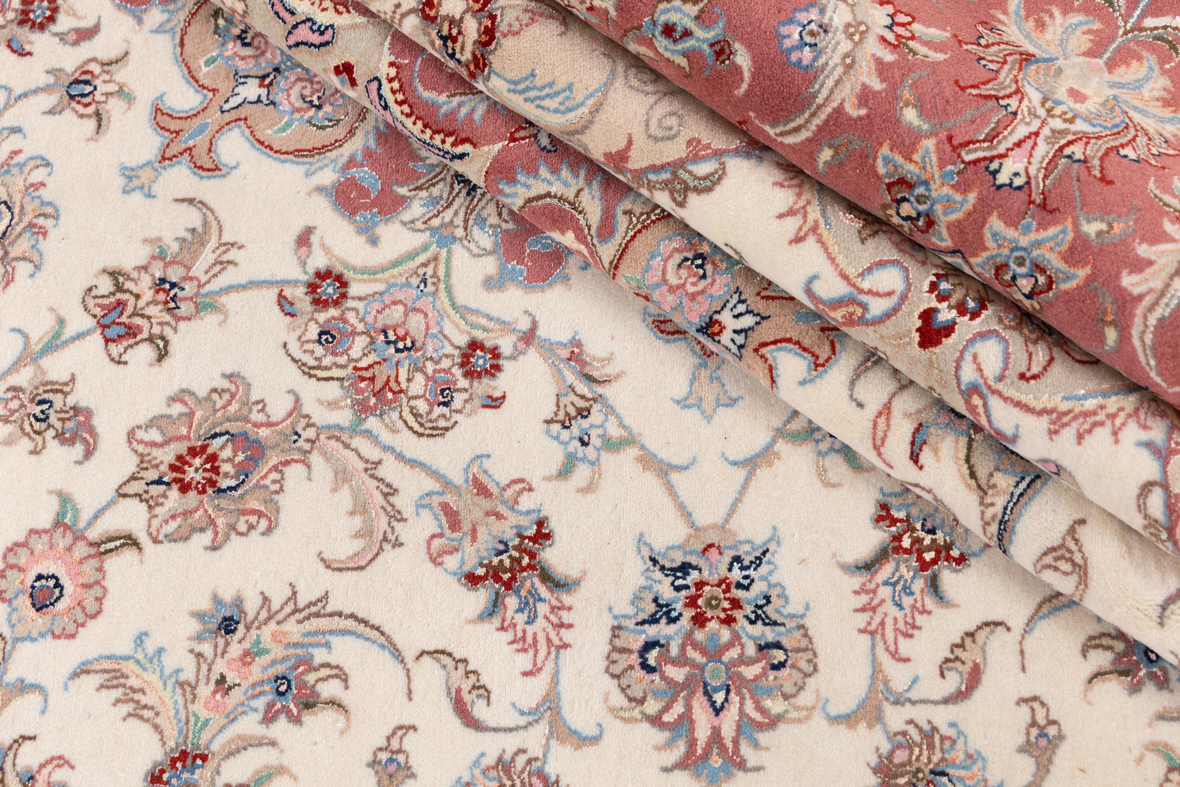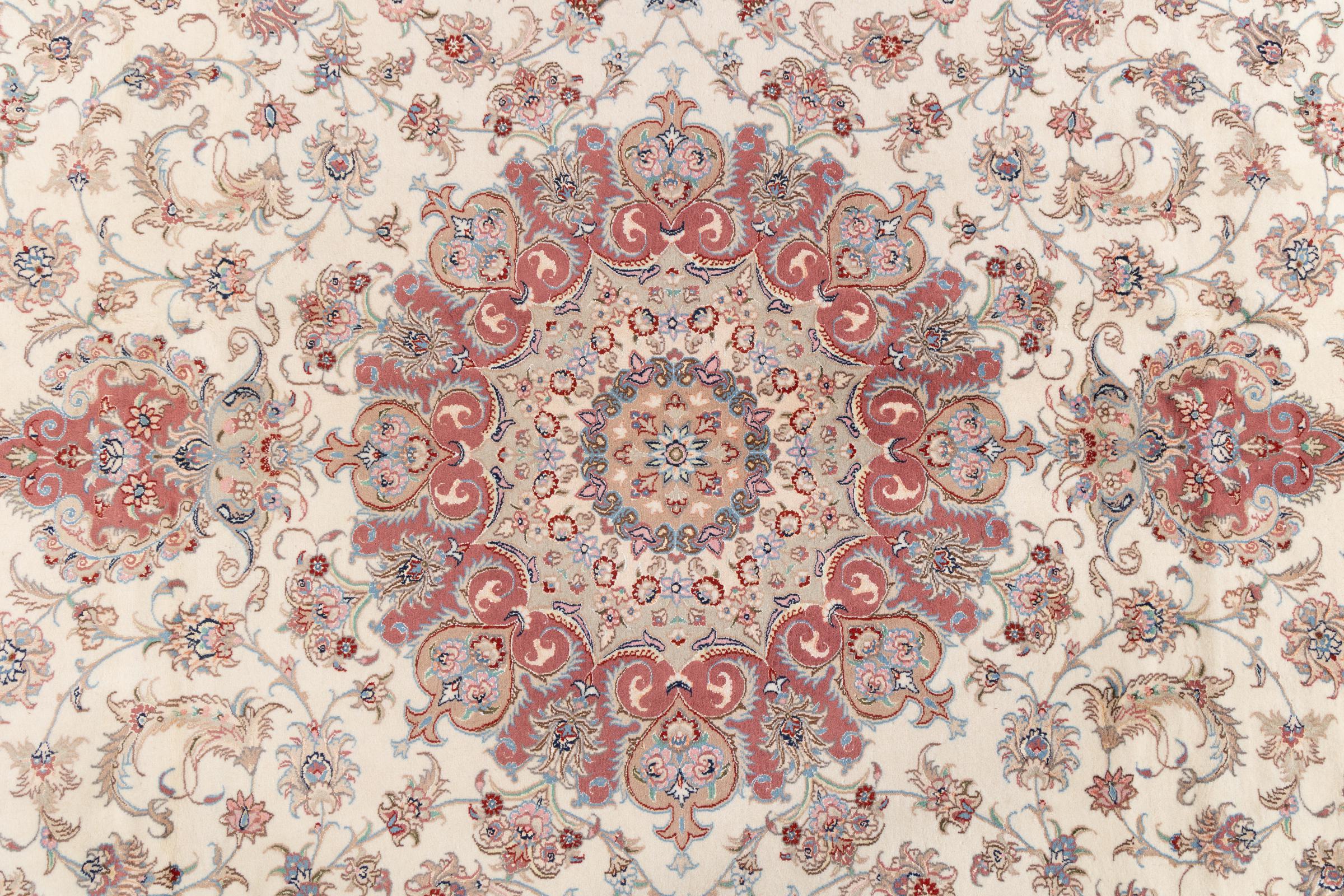 Maton nro.: 2777100100 Koko: 396x302 cm Paksuus: n. 8 mm Solmua: 450 000 - 500 000 / m² Työstäminen: Solmittu käsin Nukka: Käsinkehrätty villa Loimi: Puuvilla Alkuperä: Persia / Iran Ikä: uusi Paino: n. 36 kg Tunnetaan myös nimellä Tabriz, Tabris, Täbris, Tebriz, Tebris, 40Raj, 50Raj Készleten: Uniikki - Csak 1 van készleten