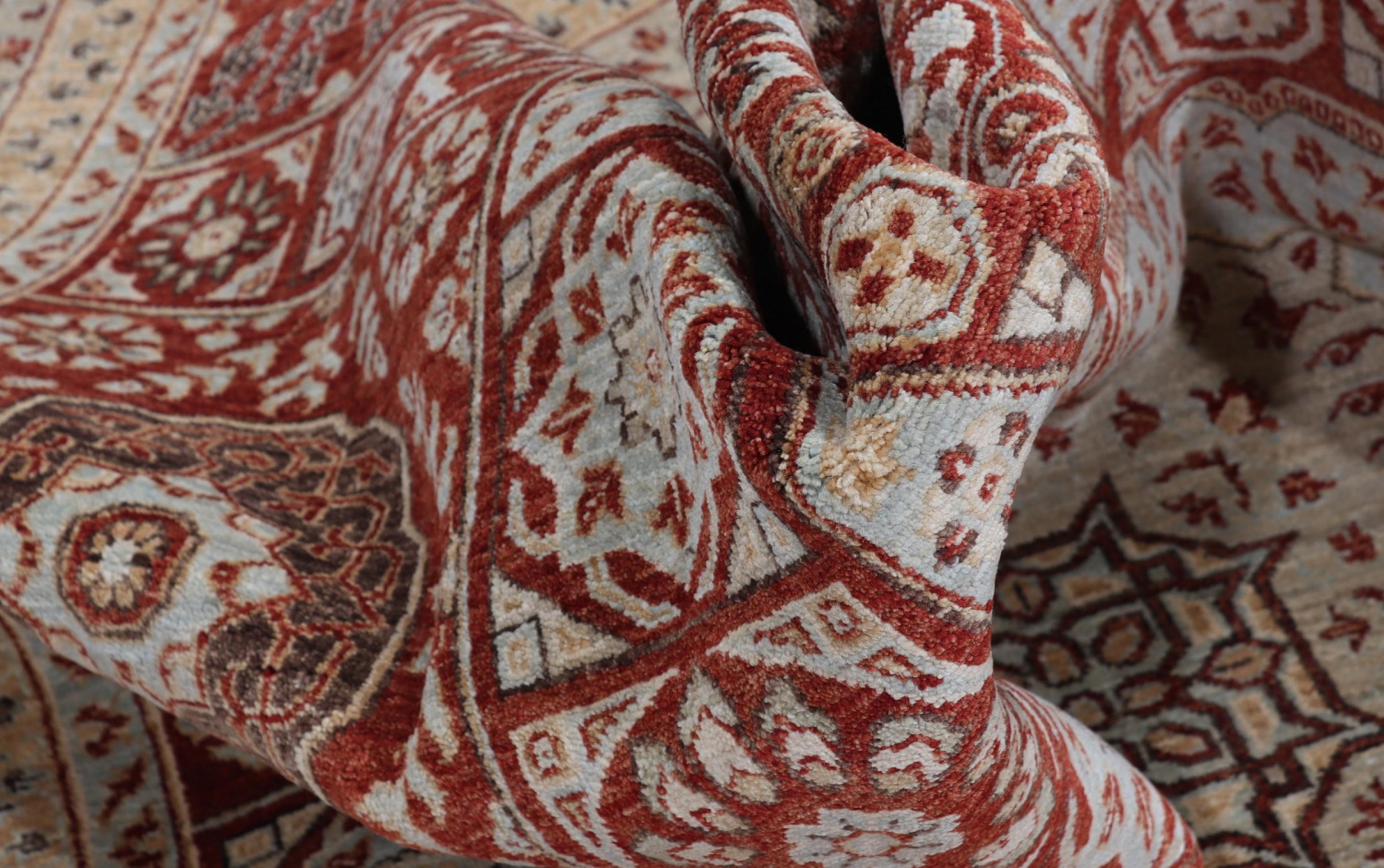 Käsinsolminnaltaan on tämä Ziegler Farahan arvokkaasta villasta Pakistanissa tehty. Erityiset käsittelymenetelmät antavat kauniin, modernin vintage-patinan sille, mikä vaikuttaa kunnollisine väreineen hyvin modernilta.